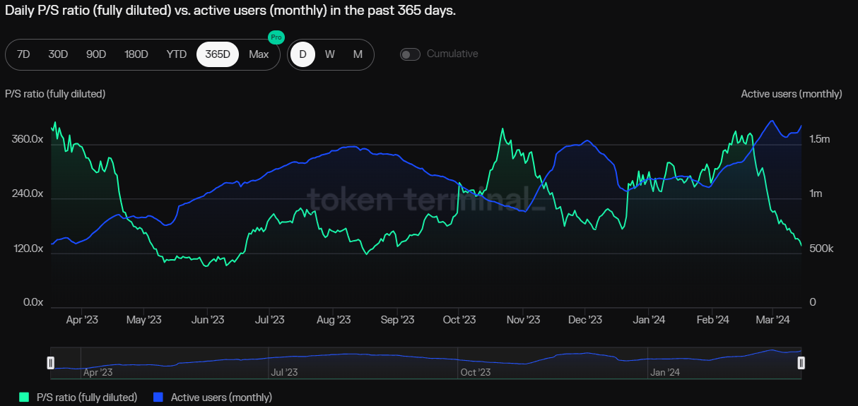 We see super chains such as OP as big beneficiaries of Dencun as more transactions move from Ethereum to L2s.The P/F multiple for OP has trended down to a 1Y low while the active users continue to go up. As investors chase hot narratives such as AI, L2s stand out as a potential value play.