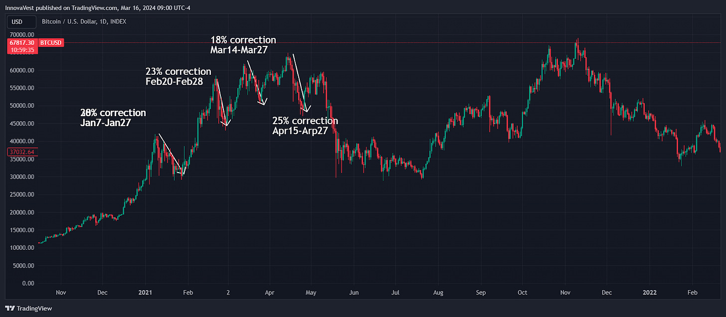 Reviewing the BTC price trajectory over previous ATH periods, a 20-30% correction is normal even in a bull market. As we witnessed in Q1 2021, when BTC first reached an ATH above $40,000. It has experienced four ~20% corrections on its way to climbing up to the next ATH of $65,000. It is not surprising to see corrections in BTC’s price as it continues its price discovery journey after hitting new ATHs. We think the biggest factor impacting future price movement is the macro environment, as well as whether spot ETF inflows can meet heightened expectations.
