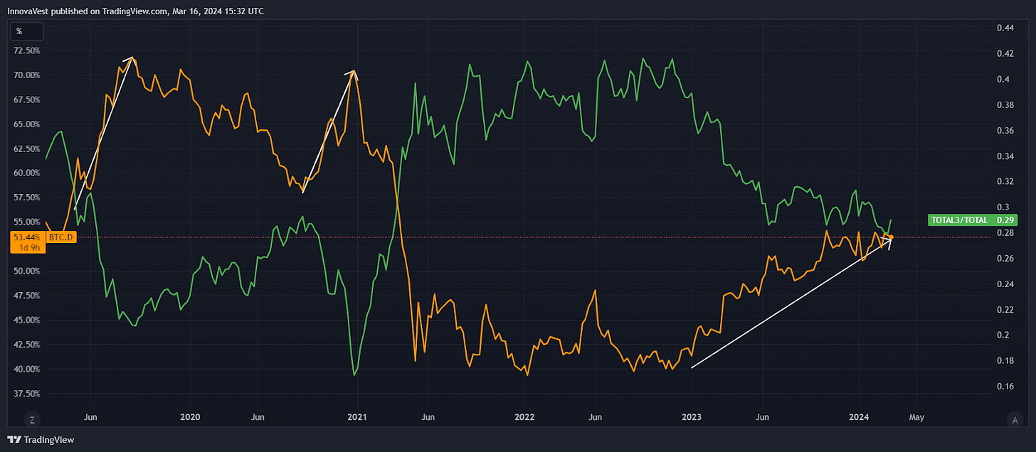 After experiencing a brief boom at the end of January this year, the Altcoin Season Index, which tracks the percent of top 50 tokens that outperform BTC in the past 90-day period, has returned to a normal level. This is happening while the BTC dominance ratio is still on the rise. In the 2020-2021 bull market, Altseason kicked in when BTC dominance hit 70%. Currently, the BTC dominance is at a post-FTX high of 53%, indicating we may still have some time to go before the true Altseason starts.