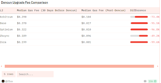 Ethereum had a successful Dencun upgrade on March 13th. The average data cost, the biggest component of an L2’s fee, has predictably dropped 10X post Dencun. The median gas cost has dropped between 50-99% among the biggest L2s. Vitalik, speaking at an ETH event last week, encouraged builders to take an L2 centric approach to take advantage of the tools available to improve performance and efficiency while building in the Ethereum ecosystem.