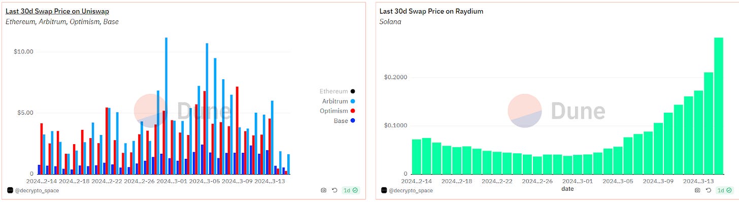 Interestingly, after Dencun, the DEX swap cost on OP and Base has dropped to a similar level seen in the Solana ecosystem.