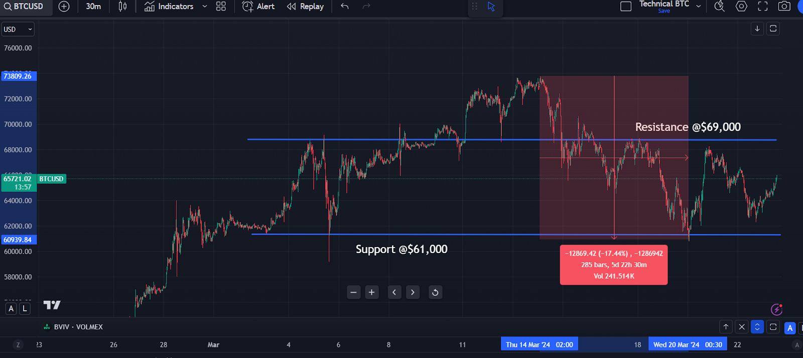 It has been a volatile week for BTC as it enters the uncharted territories after hitting ATH at ~$74,000 on March 14. As we mentioned in the last weekly, BTC has experienced episodes of ~20% corrections last time it hit ATH at $40,000 at the beginning of 2021, and on its way climbing to the new high above $60,000. In fact, on an intraday level, we already saw a 17% correction last week. The price in March has formed a support level around $61,000 and a resistance level around $69,000. We expect the BTC price to bounce between these two levels and potentially break through to the upside as halving approaches.