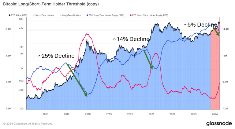 There is around 5% decline in long-term BTC holder supply YTD, indicating some profit taking from long-term holders as BTC hits the new ATH price. This is still small compared to the ~14% decline during late 2020 and ~25% decline during 2017-2018.
