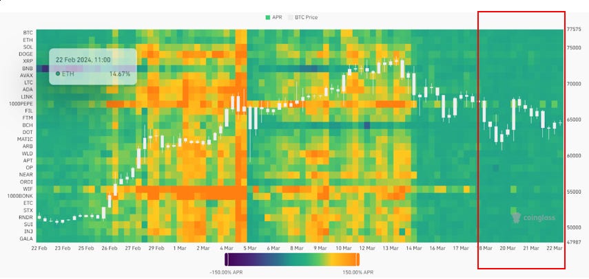 Another potential reason for BTC price weakness is the central banks’ rate decisions last week, as the dollar index DXY strengthened slightly after the FOMC meeting. The Fed decided to hold the rate steady, while Japan raised rates for the first time in 20 years and Switzerland became the first developed country to cut rates. As Noelle Archson pointed out in her “Crypto is Macro Now” newsletter, while the mean projection from the Fed Dot Plot has remained the same, the dispersion has narrowed, in an upward direction. A gradual easing policy might extend this round of the bull market, as BTC price adjusts for halving and as capital rotates down the risk curve. A correction in BTC price has flushed out some leverage in the market. The funding rate for major crypto assets have come down to a healthy level again in the last two weeks.