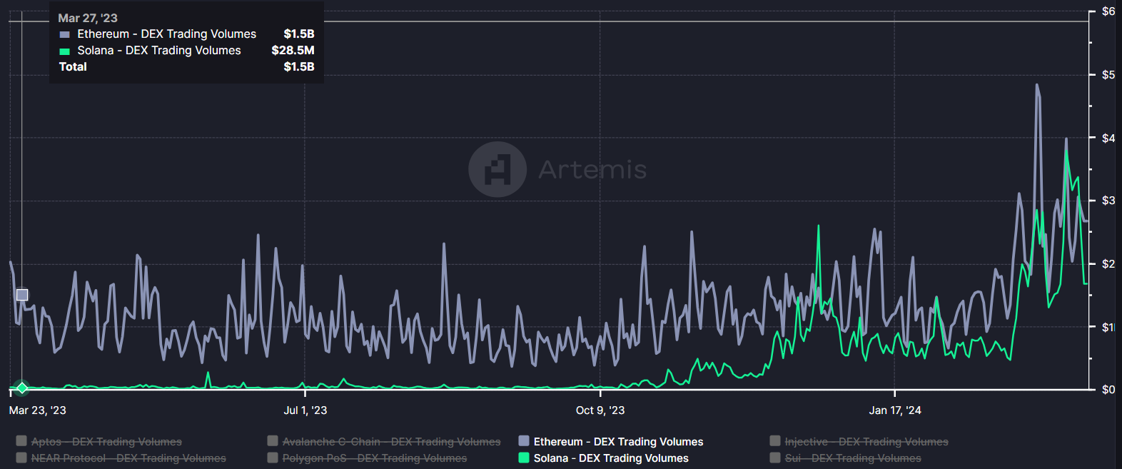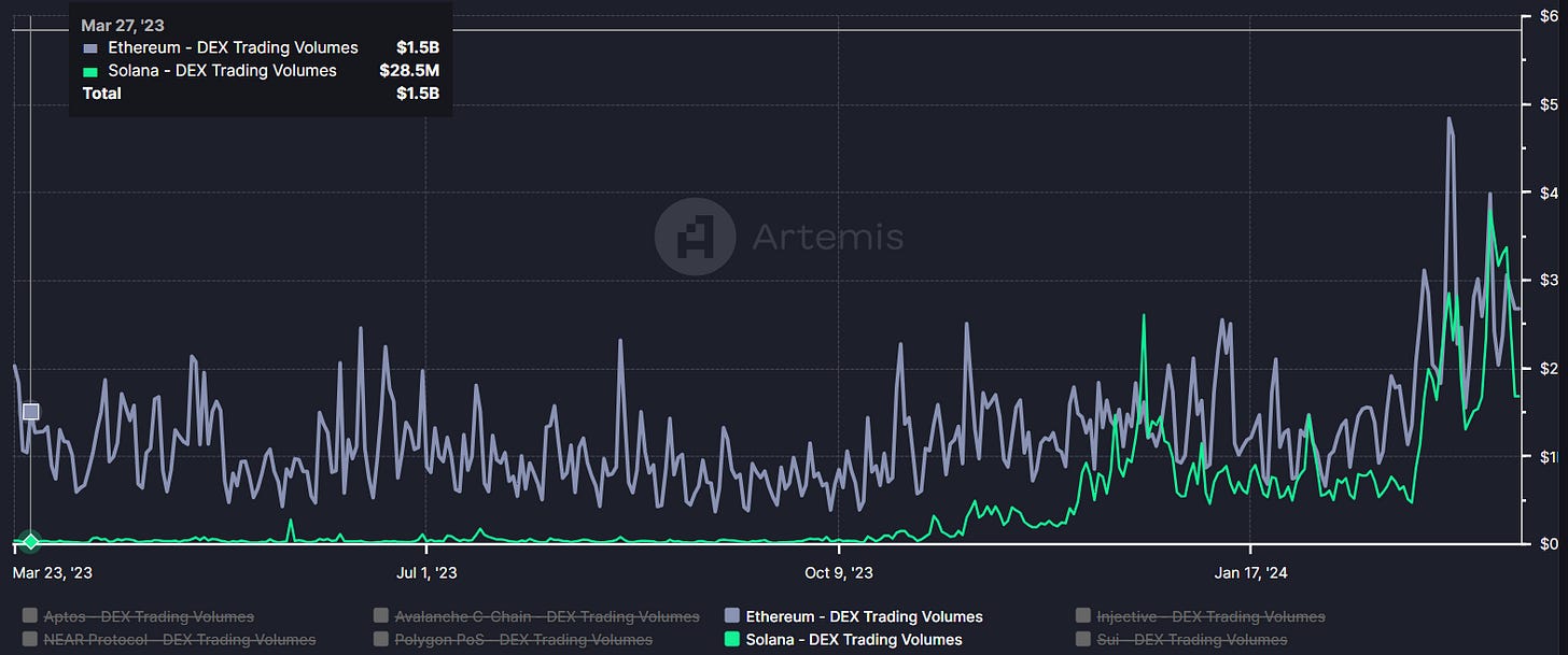 While BTC and ETH are both facing setbacks, Solana is on the rise again, with its DEX trading volume surpassing ETH for a second time since last December.